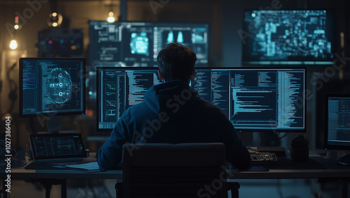 A computer engineer working on the design of software and systems, with two monitors displaying code or software interfaces in a dark blue room. The person is focused on their work at the desk,