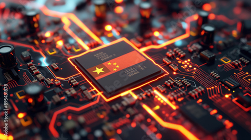 A computer microchip with the Chinese flag on a circuit board.