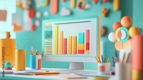 A computer monitor displaying a bar graph sits on a desk with other colorful objects