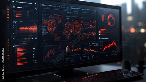 A computer monitor displaying a complex interface with a world map and various charts and graphs in red.