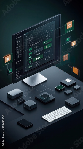 A computer monitor displays a complex network of icons and buttons. Concept of technology and organization, with the various icons representing different functions and applications