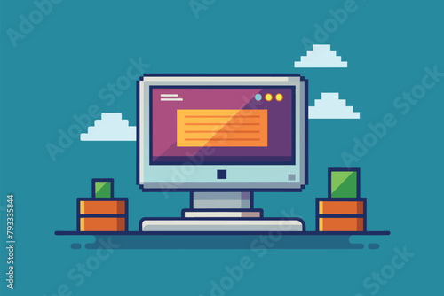 A computer monitor is placed on top of a desk, with cables visible at the back, Waiting for the game to load on the computer display, Simple and minimalist flat Vector Illustration