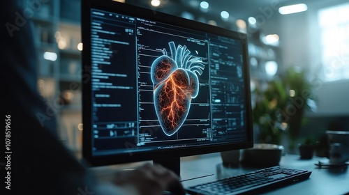 A computer screen displaying a 3D model of a human heart, with the focus on the veins and arteries.