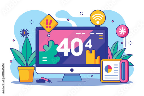 A computer screen showcases a colorful design concept addressing a fix error page fix 404 error page design concept computer screen with error
