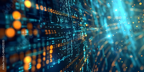 A computer screen with a blue background and orange and yellow lines. The lines are made up of binary code, which is the language of computers