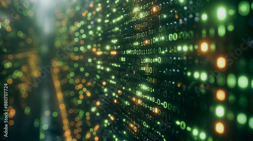 A computer screen with a green background and a row of numbers. The numbers are in different colors and are arranged in a grid. Concept of technology and complexity