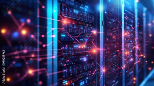 A conceptual futuristic server farm powered by blockchain technology, with illuminated data servers,