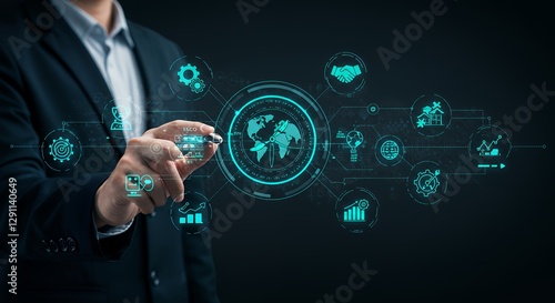 A conceptual illustration depicting sustainable business practices, featuring renewable energy, eco-friendly technology, and corporate environmental responsibility.