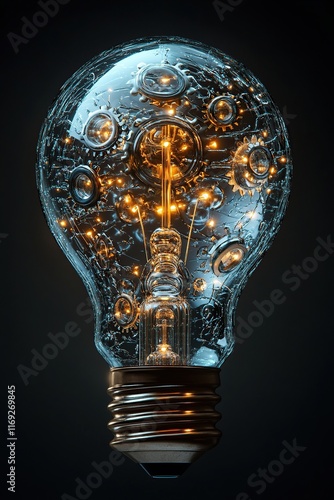 A conceptual image of a lightbulb made up of interconnected gears and circuits, symbolizing innovative ideas and technology. The lightbulb emits a soft glow against a dark gradient background.