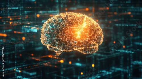 A conceptual image of artificial intelligence, with a glowing brain made of digital circuits and binary code, floating in a dark space