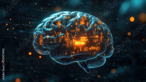 A conceptual image of artificial intelligence, with a glowing brain made of digital circuits and binary code, floating in a dark space