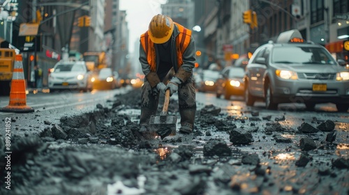 A construction worker in a neon vest and hard hat works on tearing up the asphalt on a busy city street amidst traffic and orange cones.