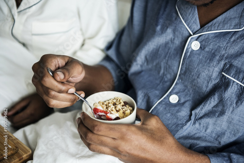 A couple having breakfast in bed