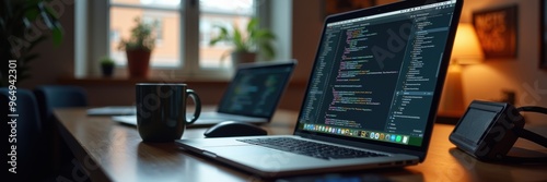A cozy workspace featuring laptops with code on the screen, a coffee cup, and a warm ambient light, perfect for tech and remote work themes.