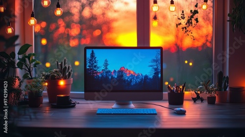 A cozy workspace with a computer, plants, and a sunset view through the window.