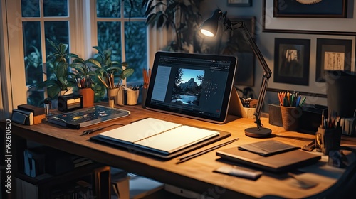 A creative desk setup with a sketchbook, tablet, and desk lamp. The open, organized workspace provides plenty of room for text placement.