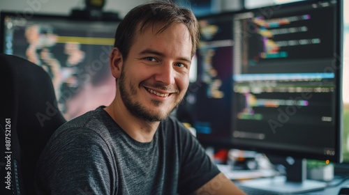 A creative male game developer in a casual t-shirt, smiling at the camera, with a computer screen displaying game code and graphics in the background, representing innovation in game development