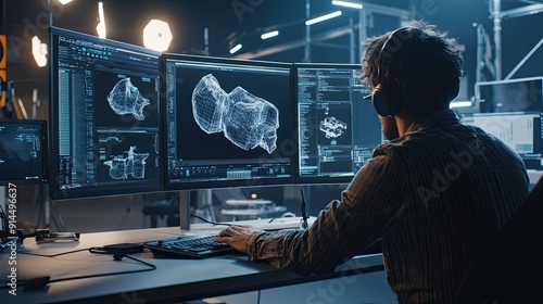 A creative professional using advanced simulation software to tweak a 3D product model, surrounded by digital screens and sleek studio equipment.