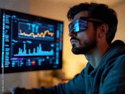 A crypto trader using augmented reality icons to view a floating screen with AI algorithms and real-time candle charts