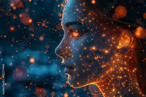 A cybernetic face embodies futuristic technology, blending artificial intelligence with human intelligence.