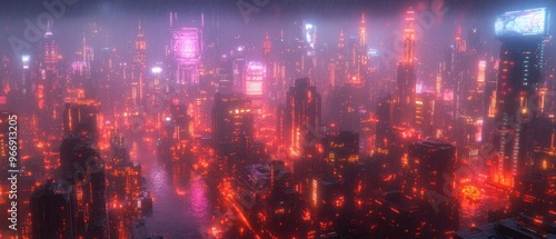 A cyberpunk city bathed in red and pink neon lights during a heavy rainstorm