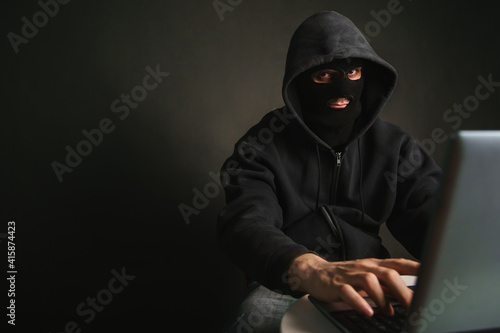A dangerous masked hooded hacker infiltrates data servers and infects their systems with viruses. Male criminal steals information through a laptop.
