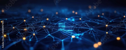 A dark blue background with an abstract digital pattern of glowing connections and lines- representing the complexity of data networks in cloud computing.