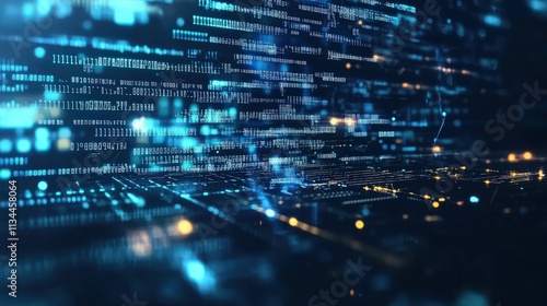 A dark, blurred background of cascading binary code transforming into programming scripts. The foreground displays a faint, digital grid, with data points floating across the screen.