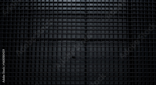 A dark metal grid pattern with small squares and subtle lighting variations across it