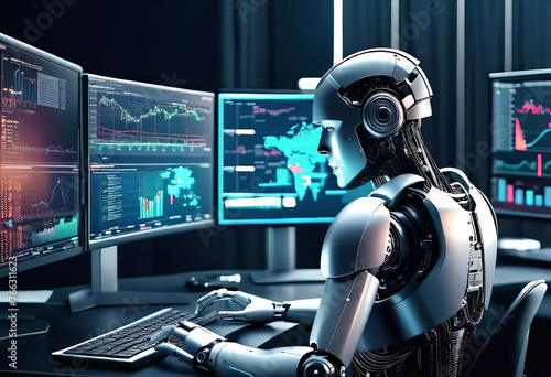A data analyst analyzes and visualizes a complex information network using artificial intelligence. Machine learning algorithm for business analytics and finance, Big data analytics using artificial i