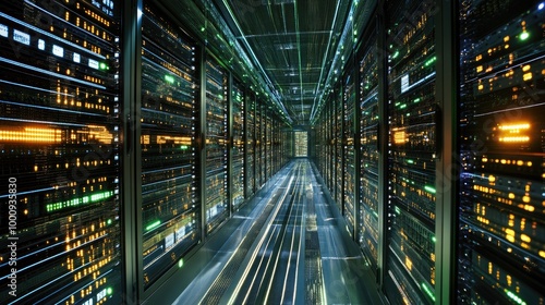 a data processing system with real-time updates, showing the rapid flow of information through complex algorithms and databases.