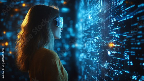 A data scientist focused on interpreting dynamic, holographic data dashboards, with interactive graphs and charts displayed in a high-tech workspace