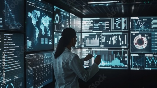 A dedicated analyst interacts with numerous data visualizations, exploring insights in a cutting-edge analytical environment during twilight hours