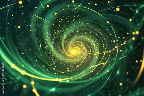 A deep green background with bright yellow glowing lines and dots in the center, creating a swirling, dynamic pattern that seems to pulse and shift