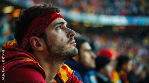 A dejected football fan watches the Spanish national team play live at a stadium.