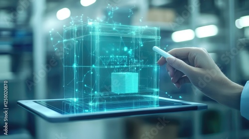 A designer's hand using a stylus to adjust packaging dimensions on a tablet.