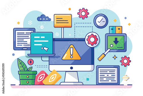 A desktop computer displays warning signs indicating software errors, surrounded by various tech elements System error, software errors, flat illustration.