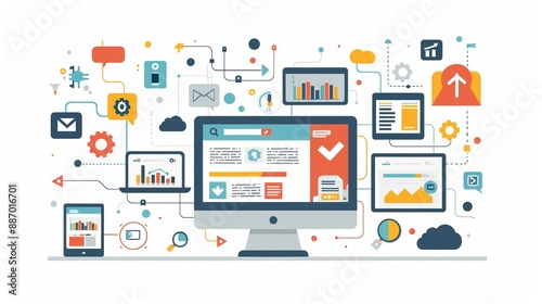 A desktop setup featuring multiple interconnected digital interfaces, demonstrating the flow of information, various graphs, and icons, emphasizing online connectivity and data integration.
