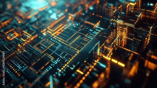 A detailed close-up of a silicon wafer under a microscope, illustrating nanotechnology in the creation of microchips and complex circuits and advanced semiconductor engineering
