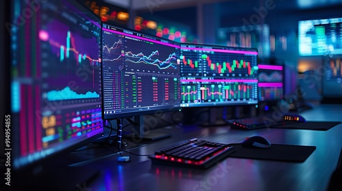 A detailed image of a graphical user interface with stock trading algorithms, featuring colorful charts and live data on multiple screens.