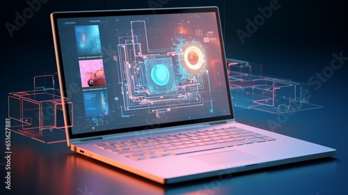 a detailed image of a laptop showcasing a pristine mockup screen, poised for programming, with a hologram hovering nearby, enhancing the coding experience.