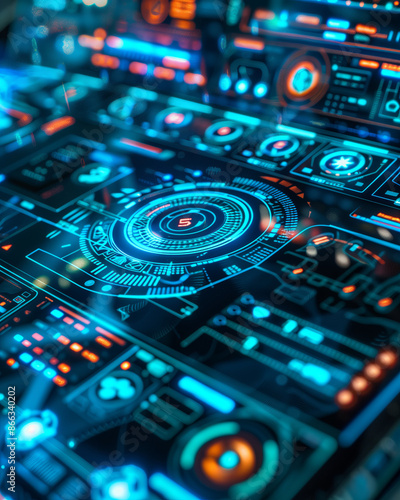 A detailed photograph of a sleek futuristic touchscreen interface displaying various data analytics and technological elements.