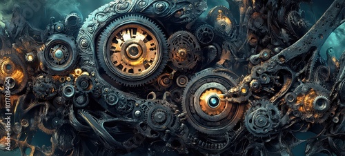 A detailed steampunk-inspired illustration featuring gears, cogs, and mechanical creatures