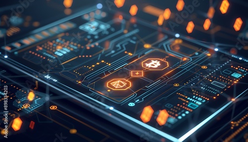 A detailed view of a blockchain ledger interface on a digital tablet, with glowing data encryption symbols and advanced analytics, isolated against a dark backdrop.