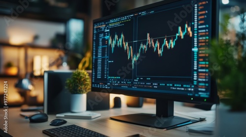 A detailed view of a financial chart on a computer screen, showing fluctuating stock prices and trend lines, set against a clean, modern workspace
