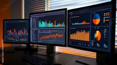 A detailed view of survey data analysis, with colorful graphs and statistical insights displayed on multiple computer monitors.