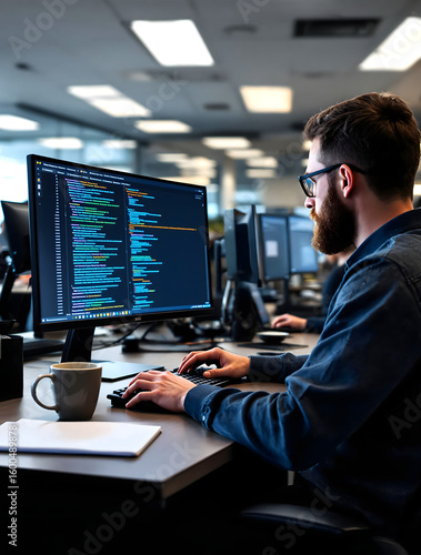 A Developer coding on a monitor, with the screen displaying complex software. Represents technology, programming, and innovation. Perfect for web development, cybersecurity, and IT concepts.