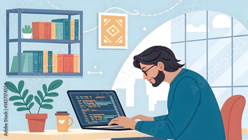 A developer engrossed in coding on a laptop, with vibrant code displayed on the screen in a tech-savvy workspace. Perfect for software development, programming, and technology-related themes.