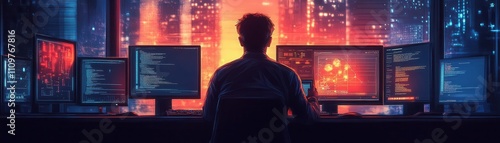 A developer testing Kubernetes in a modern lab filled with glowing monitors, dramatic shadows, and film textures