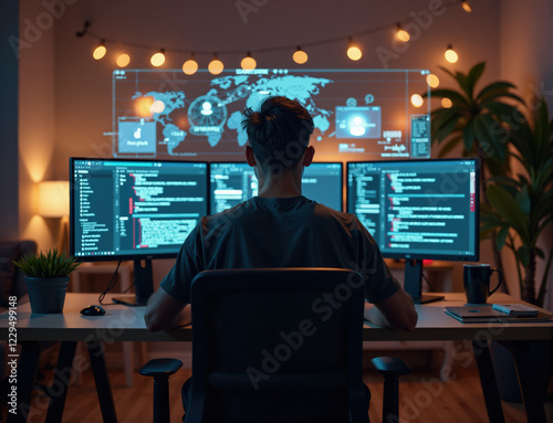 A developer works in a warmly lit office, surrounded by monitors displaying complex programming scripts.